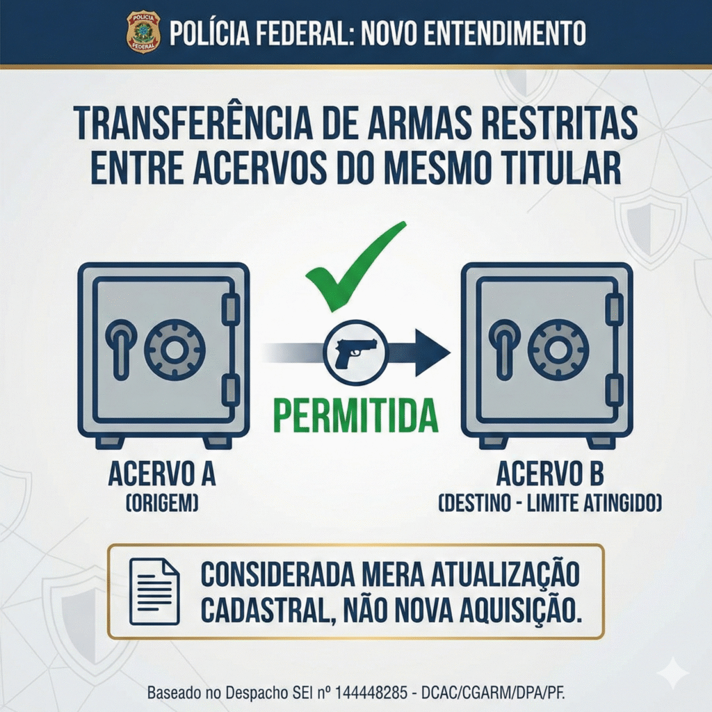 A Polícia Federal confirmou que a transferência de armas de calibre restrito entre acervos do mesmo titular é permitida.